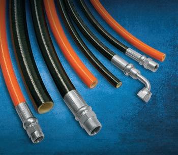 The line of SAE 100 R7, R8 and R18 thermoplastic hydraulic hoses is designed for a broad range of applications. SAE R100 R7 is a nylon hose for medium-pressure hydraulic systems, such as machine tool applications and lift equipment. Available in eight sizes between 1/8-in. I.D. and 1-in. I.D., this hose is rated between 1,000 psi and 3,000 psi, and 4,000 and 12,000 psi minimum burst pressure. The R18 and R8 thermoplastic nylon hoses are suited for high-pressure hydraulic systems and for use in construction, agricultural, off-highway vehicle and plant maintenance equipment. The R18 hose is rated at 3,000 psi, and the R8 between 3,500 and 5,000 psi. The R18 hose is available in four sizes from 1/4-in. to 1/2-in. I.D., and the R8 hose in four sizes from 3/16-in. to 1/2-in. I.D. The working temperature range for all hoses is minus 40°F to plus
