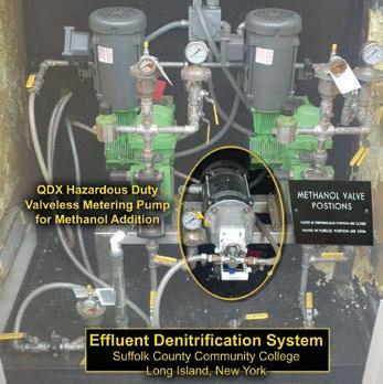 Designed for small and mid-size treatment facilities, Fluid Metering’s valveless CeramPump QDX hazardous-duty metering pump is used for the low-volume addition of methanol for nitrate removal in wastewater effluent. The valveless design prevents the pump from becoming airbound and losing prime, which can be a problem where flow rates are low. The pump has only one moving part in contact with the process fluid, a rotating and reciprocating ceramic piston. The piston rotates during the pumping cycle and is synchronized to alternately open and close the inlet and outlet ports of the pump, effectively functioning as a valve. At no point are the inlet and outlet ports interconnected, thus eliminating the need for check valves. The pump drive is FMI’s QDX hazardous duty drive, typically required for pumping methanol.