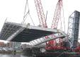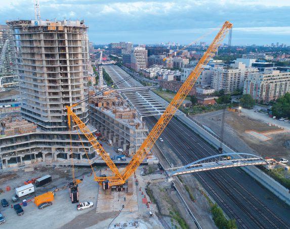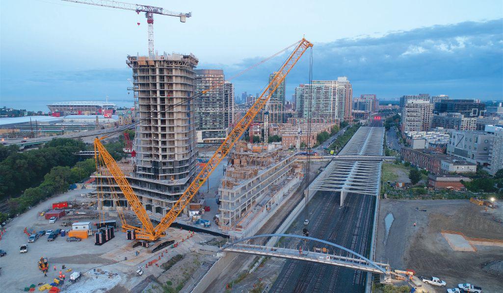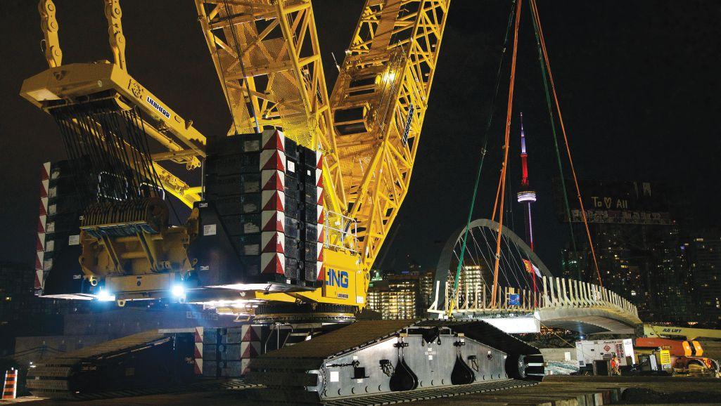 stainless steel pedestrian bridge construction project nearing completion in downtown Toronto has called for two of North America’s biggest crawlers.
