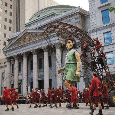 uring Montréal’s 375th birthday celebrations last year, two visitors to the city stood out among all others – a pair of 10-metre-tall marionettes called the Deep Sea Diver and the Little Girl Giant. The puppets come from the Royal-De-Luxe street performance troupe from Nantes, France. The giants’ gestures and movements are controlled by a bevy of puppeteers who maneuver them by swinging on control ropes like pirates in a swashbuckling movie. Heavily customized mobile cranes keep the marionettes upright and move them around through the city while the puppeteers provide the illusion that the puppets are moving by themselves.