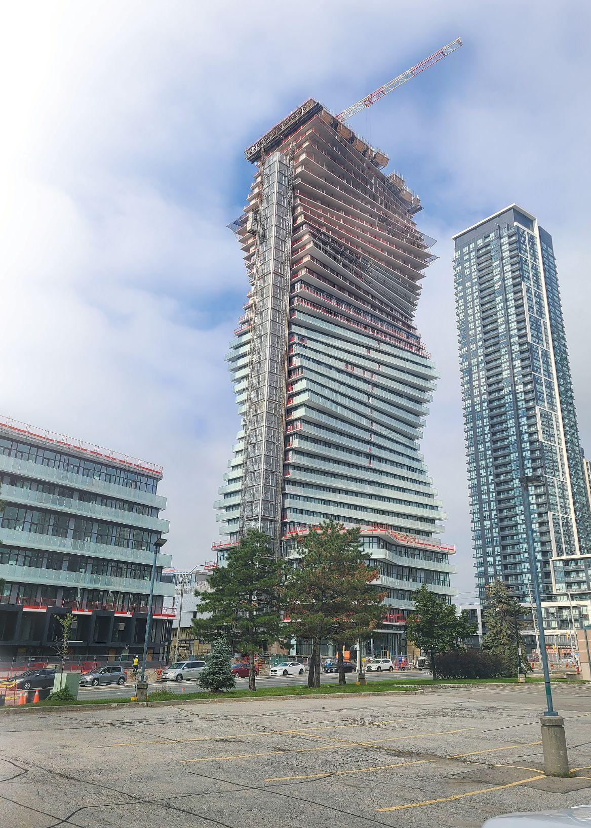 A hoist common tower flanks one of two planned M City condominiums in Mississauga, Ont. Rather than tying construction hoists in a row along the building face, a common tower houses up to six large hoists within one system, plus a staircase. Only one suite per building floor is needed to load in materials from multiple hoist cars. Oxford Builders says this is the first time a common tower erected with these specific materials (inset) has been used in Canada. “Typically, a runback is tied through a unique custom design made of steel — i.e., scaffold or heavy legs — but in this system, it is a mix of aluminum and galvanized steel, making it lighter and easier to install,” explains Shane Dick, tower crane and hoist sales rep for Oxford Builders. “The tie-in points go from the edge of the concrete building out to the hoist way. This makes the floor access more level yet strong. If the builder wants to begin occupancy, they have an option to keep the hoists running while cutting off the floor access.” Construction is expected to be completed on the M City site by August 2022.