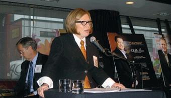 Vanessa Black, of Upper Canada Food Group Ltd., exhibits at last year’s inaugural CRFA Show (top); Mildred Pierce Group president Donna Dooher addresses the October launch reception for the 2009 CRFA Show.