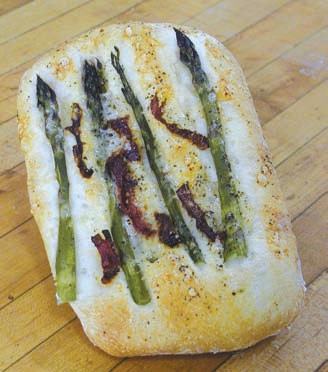 Andrea Damon Gibson is the president of Fred’s Bread. Fred’s Bread’s cheddar loaves (above) are made with sourdough starter exclusively, while the Ontario Asparagus and Cheddar Pizza (far right) is a seasonal specialty and is made with a 24-hour polish using fresh yeast.