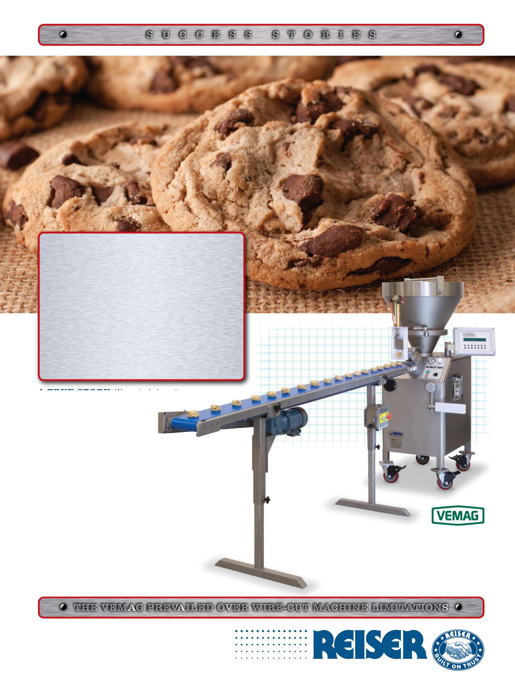 Then she called Reiser. The solution was our Vemag cookie dough depositor with a guillotine cutoff. Even at high production speeds, the Vemag allowed her to run all of her recipes with precise portioning accuracy. Her chocolate chunks and inclusions came through whole. And the guillotine cutting system actually exposed the chunks and inclusions. Now she is able to produce mouth-watering cookies with great eye appeal that out-sell all the other cookies in the bakery case.