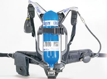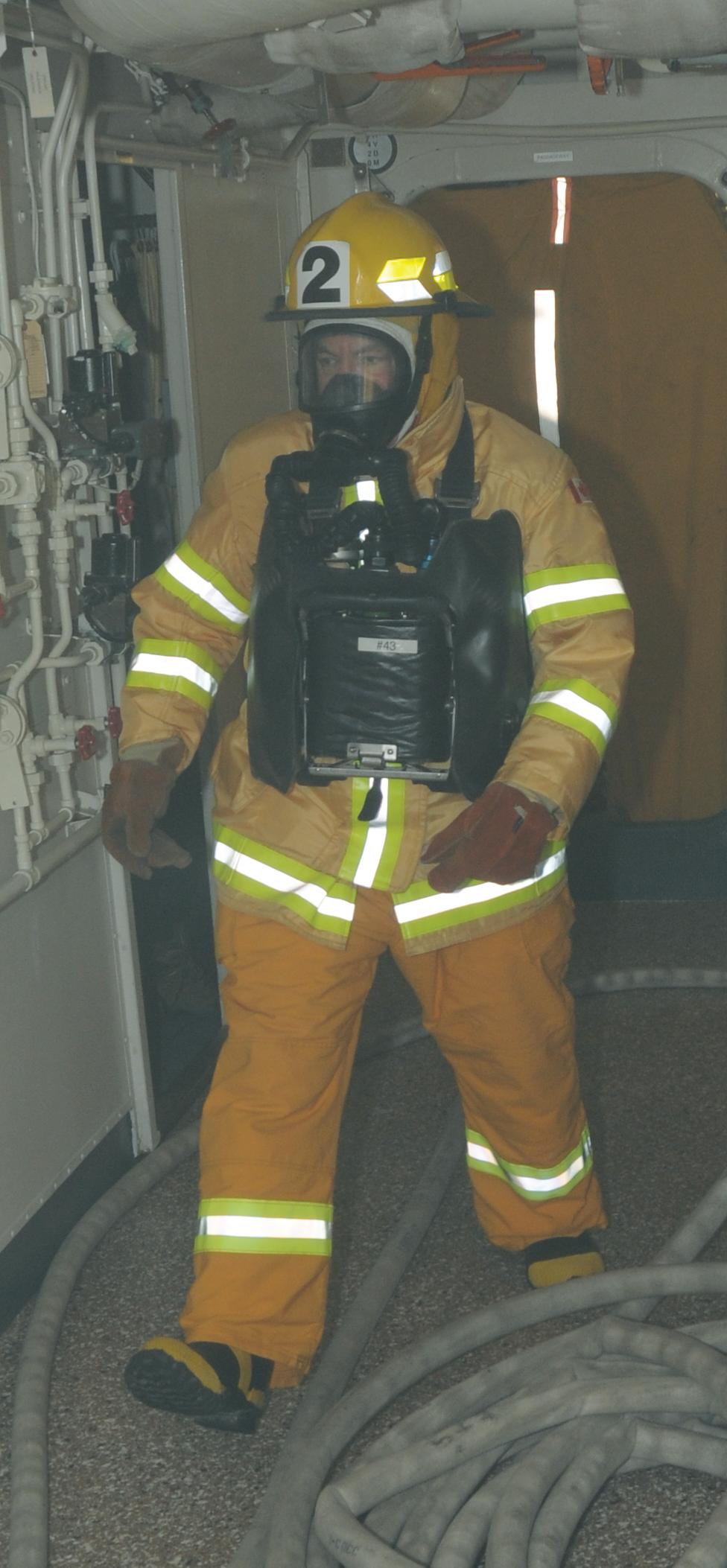 A ļ¬re drill in shipās laundry; lines are charged and the ļ¬reļ¬ghter is in full turnout gear and SCBA. He is wearing a CHEMOX re-breather, which is being phased out as the entire ļ¬eet is converting to Drager SCBA.