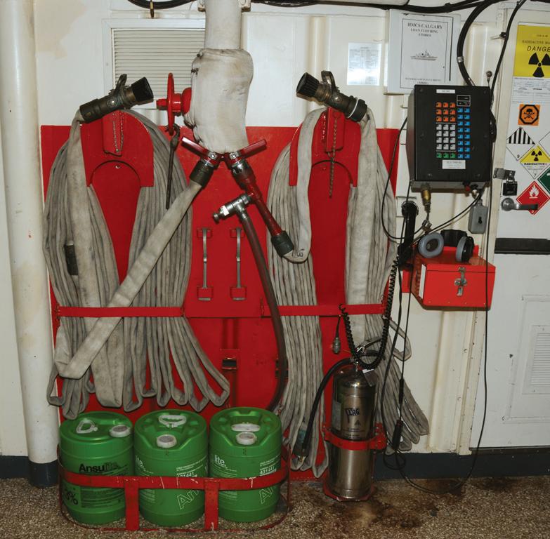 Calgary has 46 ļ¬re hydrants around the ship, inside and out, and two pre-connected 1.5-inch lines with foam applicators. Redundant water mains run the length of the ship, pressured by pumps with two backup systems. Halon is still used in critical areas such as conļ¬ned spaces in the engine room turbine enclosures and for high-tech systems. An engine room ļ¬re on HMCS Fredericton in May was quickly extinguished by the Halon system but it took ļ¬reļ¬ghters more than an hour of conļ¬ned-space work to declare the ļ¬re ofļ¬cially out.
