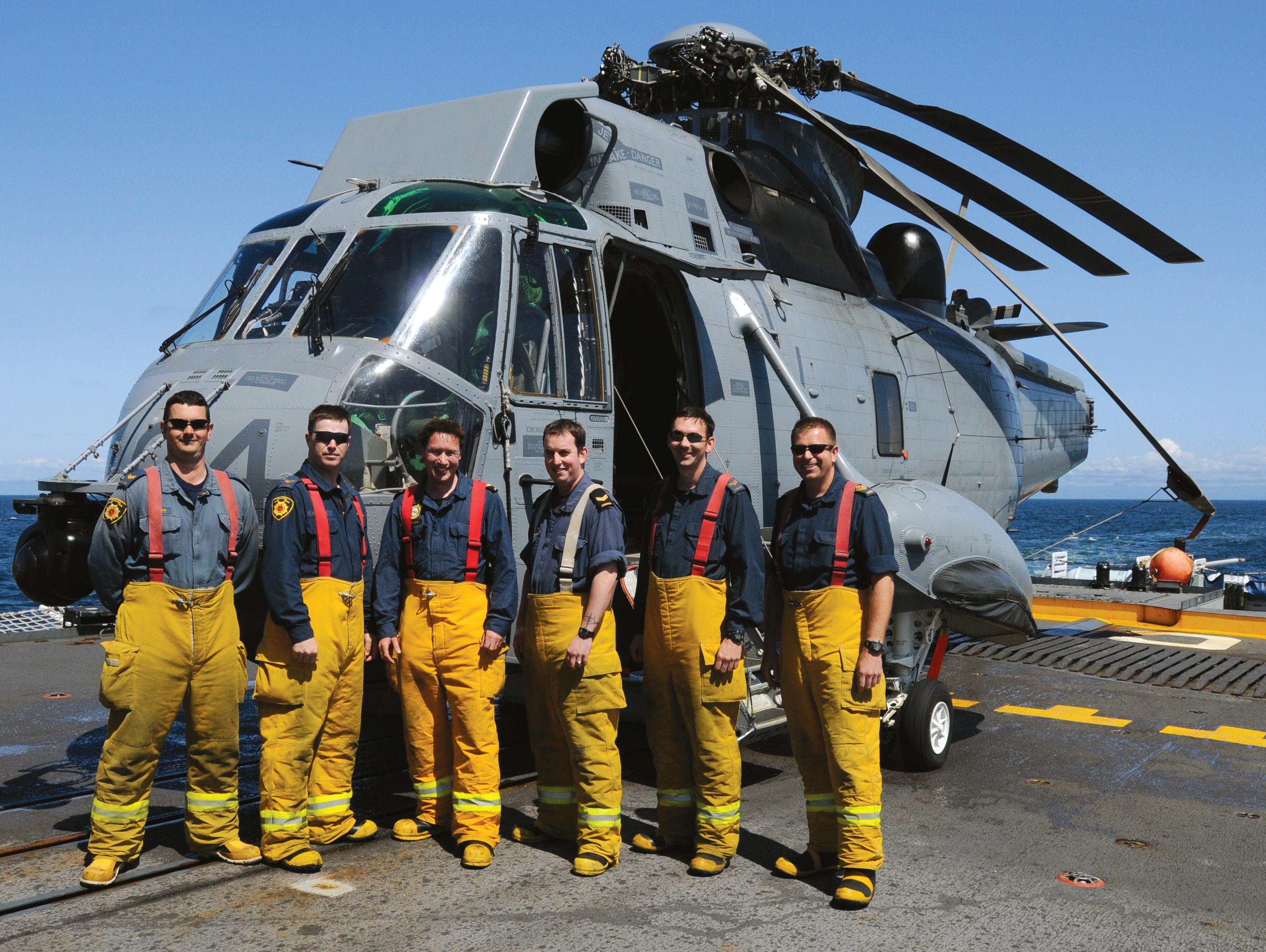 HMCS Calgaryās ļ¬reļ¬ghters in front of the shipās CH-124 Sea King helicopter: Cpl. Greg Crowe (left), Cpl. Chris MacDonald, LS Tony Deman, LS Chris Saunderson, Cpl. Chuck Wigger, Sgt. Ernie Payne.