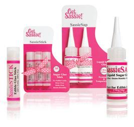 SassieSap is a two-way liquid sugar glue that can be used, wet or dry, to apply decorations to fondant cakes and cookies. It comes with a convenient applicator and can be applied up to 12 hours in advance. SassieStick is a clear-drying edible sugar glue stick created to stand up in even the most humid environments. www.getsassie.com