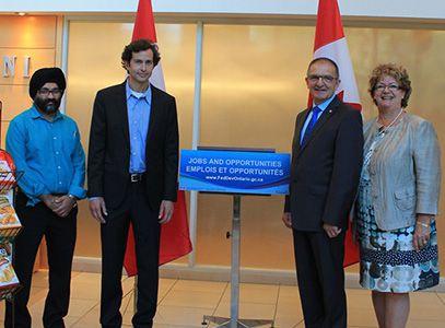 From left to right: Deep Virk, controller, Furlani’s Food Corporation; Jonathan Kawaja, chief operating officer, Furlani’s Food Corporation; Wladyslaw Lizon, MP for Mississauga East−Cooksville; and Anne Sado, president of George Brown College, after the funding announcement for Furlani’s Food Corporation and George Brown College.