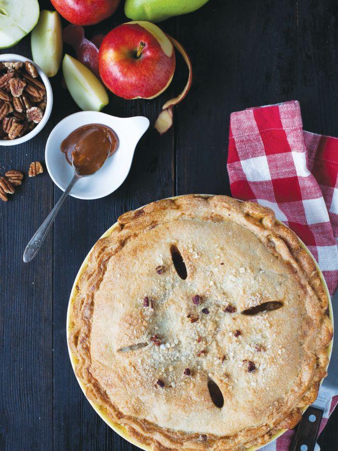 5. Sprinkle a good handful of the praline mixture over the apple/pears in the pie.
