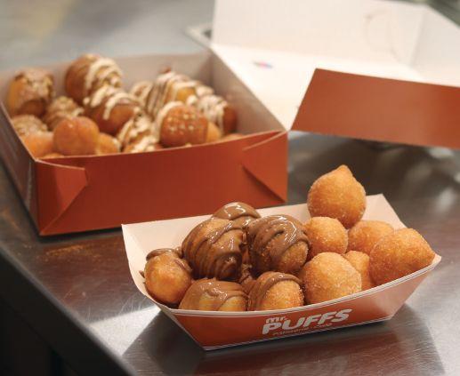 ing the wheel, but magic happens after the oil bath when Puffs are flipped onto a counter-top basket prior to dressing. Puffs boasts a growing variety of toppings, adding blueberry coulis and nut-free peanut butter to the list, as well as new flavours for holidays and special occasions.