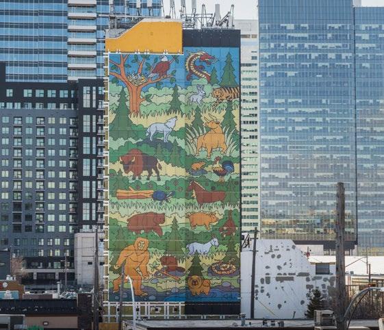 Perhaps the most noticeable feature of the project is the world’s largest solar panel mural. Designed by Indigenous artist Lance Cardinal, the 85-foot mural titled “The Land We Share” integrates Indigenous and Chinese symbolism, celebrating Edmonton’s diverse cultural heritage. It was painted over the 30,000 square feet of the building’s Mitrex eFacade PRO plus BIPV system.