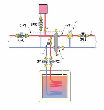 Les circulateurs (P1) et (P2) peuvent tous les deux être désactivés si la chaleur en provenance de la source primitive est juste suffisante pour satisfaire la température d’eau d’alimentation requise. Cela permettra à la chaleur de contourner entièrement le réservoir thermique, ce qui pourra être bénéfique lors de la récupération des charges en retour au point de consigne.