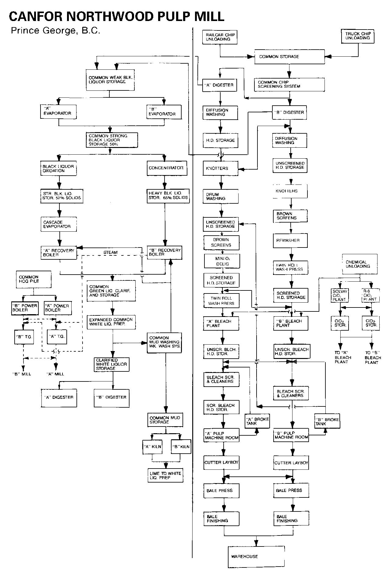 British Columbia Forest Products Ltd., (a joint venture of Argus Corp., Scott Paper and Mead Corporation) acquired 66% control of Alexandra Forest Industries in 1963. AFI had been in initial development of its tenure in the Mackenzie Timber Supply Area and the first sawmill was constructed and began operation in July 1966. BCFP acquired total ownership of AFI in January 1967 and in November 1969 announced plans to construct a 450 t/d market kraft pulp mill and a stud mill on the same site. The stud mill, now dismantled, began operation in September 1971 and the pulp mill in December 1972. A third sawmill started up in 1974. A second cooking and brown stock line for sawdust was added in late 1996. BCFP was acquired by New Zealand-based Fletcher Challenge Limited in 1987 and in September 1988 BCFP was consolidated with Crown Forest Industries Limited, another FCL-controlled company, to form Fletcher Challenge Canada Limited. In 1996, FCCL restructured to create separate subsidiaries for pulp (FCC Pulp Operations) and southern solid wood operations (TimberWest Forest Corporation), distinctly separate from the core paper business. TWFC was subsequently divested and it, in turn, acquired the Mackenzie woodlands and lumber operations, TimberNorth, in January 1996 and then sold it to Slocan Norske Skog in June 1997. Controlling interest in FCCL was acquired by Norske Skog in October 2000; Norske Skog in turn, sold Mackenzie Pulp Operations to Pope & Talbot Ltd. in June 2001. The mill shut down in 2008 after Pope & Talbot went bankrupt. In September