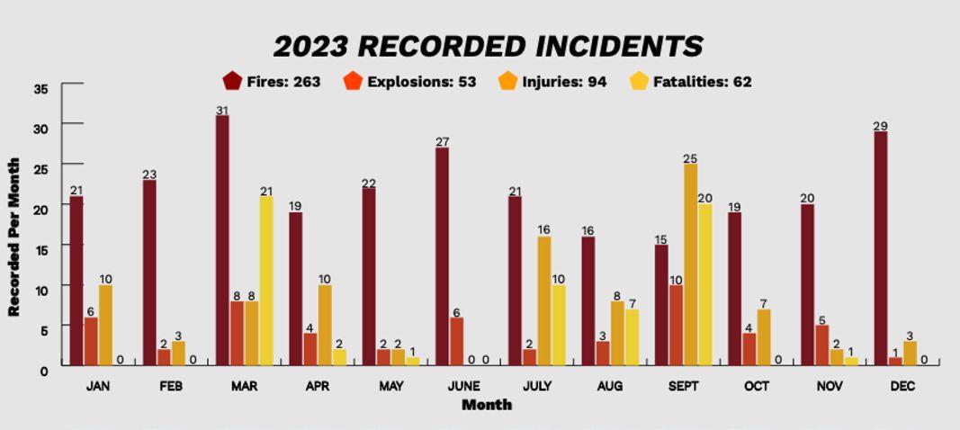 • Coal handling and mining: Despite representing only 3.5% of total incidents, coal, due to its high combustibility, accounted for 68% of fatalities in 2023.