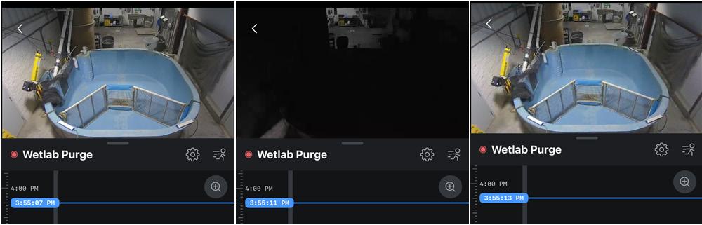 Furthermore, consulting with remote video monitoring equipment allowed staff to witness the lighting in the area quickly turn off and on, while another camera attached to the affected RAS recirculating pump stand shook as the pumps stopped and restarted. Continued monitoring provided