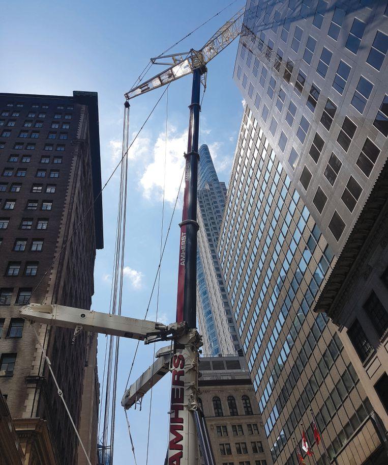 A case in point: In late May, Amherst Crane Rentals placed mechanical equipment atop a 22-storey building on Yonge Street, between Adelaide and Richmond streets, in the heart of downtown Toronto’s business core. With a 15,000-lb. cooling tower the heaviest lift, and a relatively narrow area to work from, Amherst brought in one of its heavyweights — a 500-ton Liebherr LTM 1400 all-terrain crane.