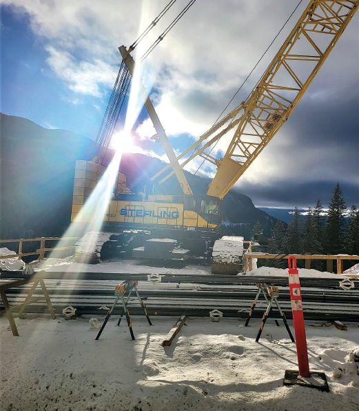 Project: This crane is on a project of a major upgrade of the Trans-Canada Highway improving the highway through the most challenging section of the Kicking Horse Canyon in the Rocky Mountains near Golden, British Columbia. The crane is sitting on a platform on the edge of the mountain. The highway is being upgraded from two lanes to a divided four lane.