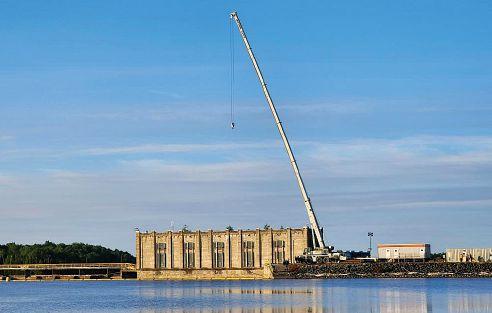 Project: Hoisting sheet piles and vibro hammer. Use of suspended man basket for worker access for dam reconstruction.