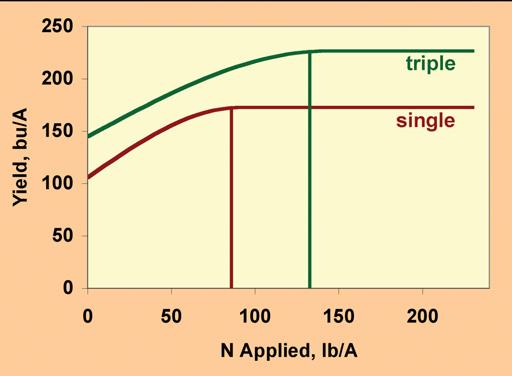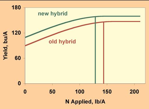 Fred Below, professor of crop physiology at the University of Illinois, recently pointed out that new hybrids respond differently to nitrogen. The general trend is shown in Figure 1, comparing a hybrid of the early 1980s to one that is grown today in central Illinois. The new hybrid yields more with less nitrogen, though the gain in yield per unit applied does not really differ. The major difference is capture of nitrogen from the soil. This historical change was also evident in Dr. Matthijs Tollenaar’s studies comparing hybrids from the 1960s and 1990s in Ontario.
