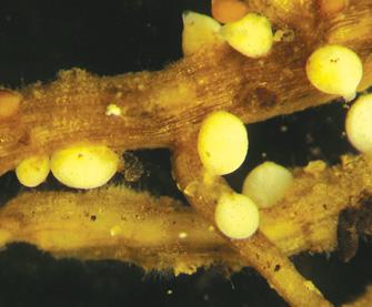 The cysts of SCN infect the roots of the soybean plant, leaving stunted, yellow and dying plants standing in fields.