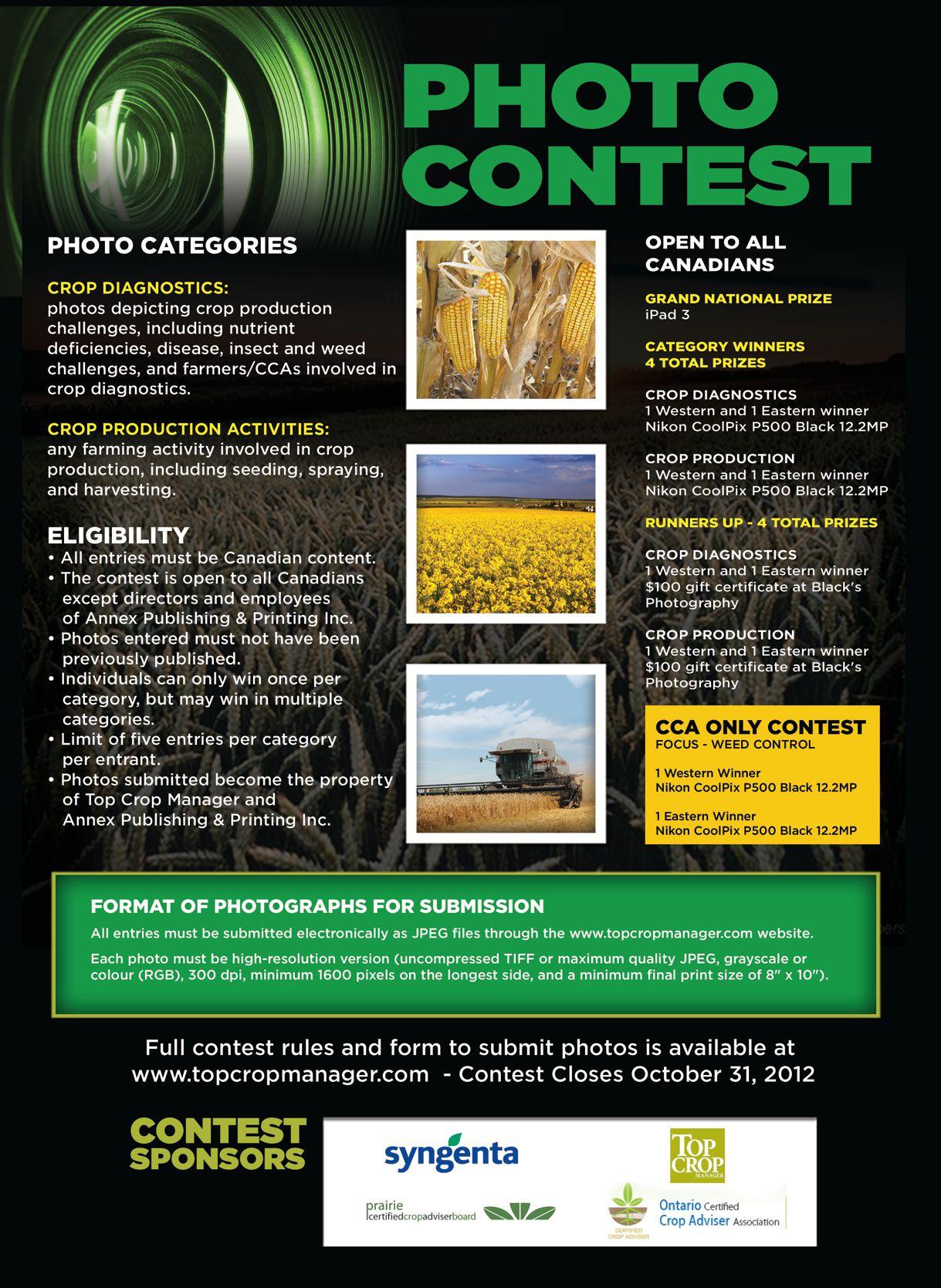 All of the above - $76.19 Cdn. plus tax Occasionally, Top Crop Manager will mail information on behalf of industryrelated groups whose products and services we believe may be of interest to you. If you prefer not to receive this information, please contact our circulation department in any of the four ways listed above. No part of the editorial content of this publication may be reprinted without the publisher’s written permission © 2012 Annex Publishing and Printing Inc. All rights reserved. Opinions expressed in this magazine are not necessarily those of the editor or the publisher. No liability is assumed for errors or omissions. All advertising is subject to the publisher’s approval. Such approval does not imply any endorsement of the products or services advertised. Publisher reserves the right to refuse advertising that does not meet the standards of the publication.