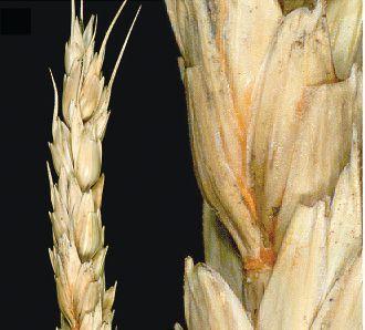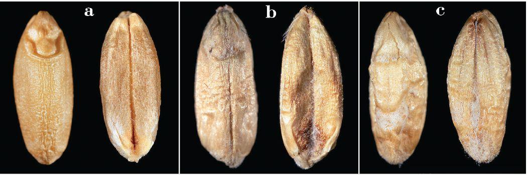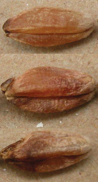 ABOVE: Amber durum: a = sound; b = moderate symptoms of Fusarium damaged kernels (FDK); c = severe symptoms of FDK.