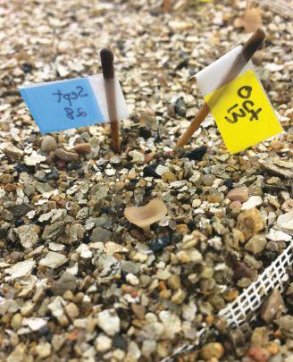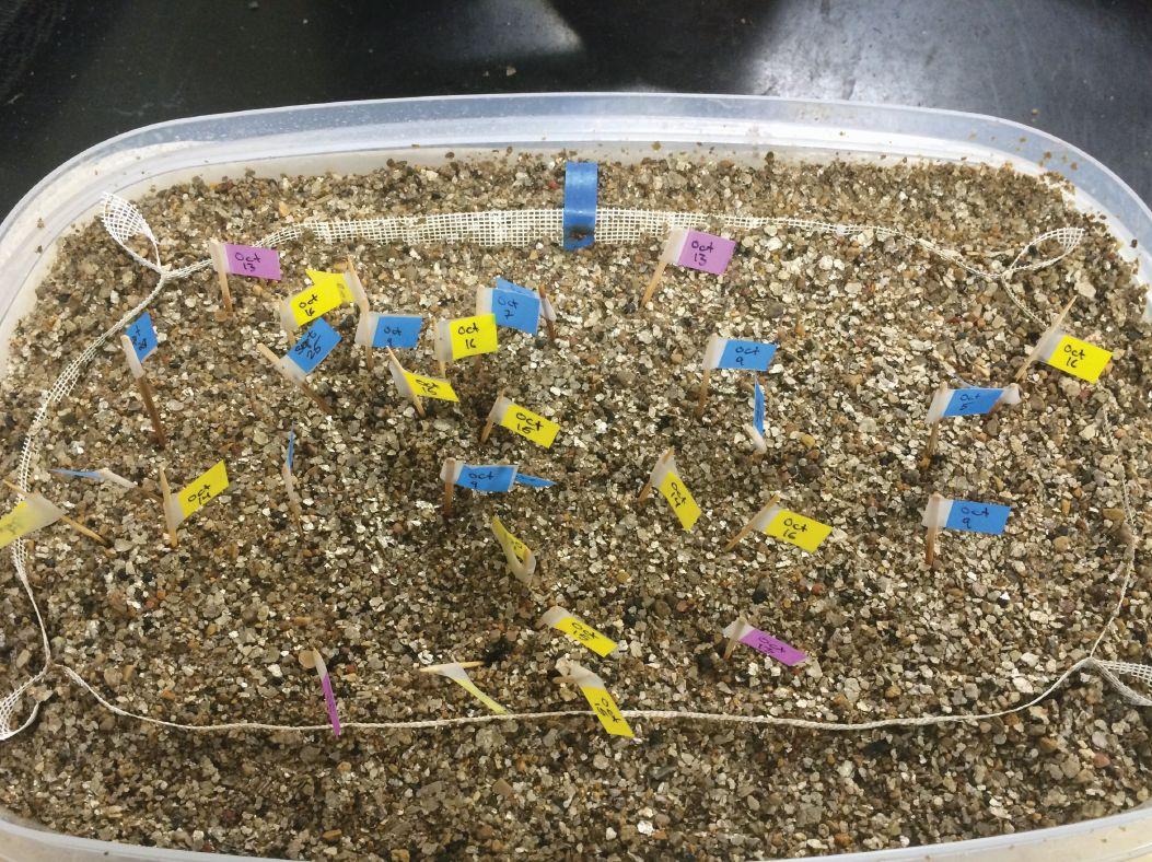 ABOVE: Test of sclerotia germination in a depot under optimal conditions in a growth chamber. Each flag marks the first appearance of apothecia from the 50 buried sclerotia.