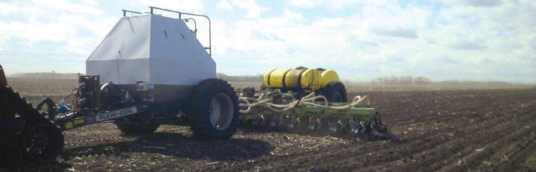 Bourgault 3320 precision hoe drill planted at 5 miles per hour with a modified boot to band liquid starter below the seed.