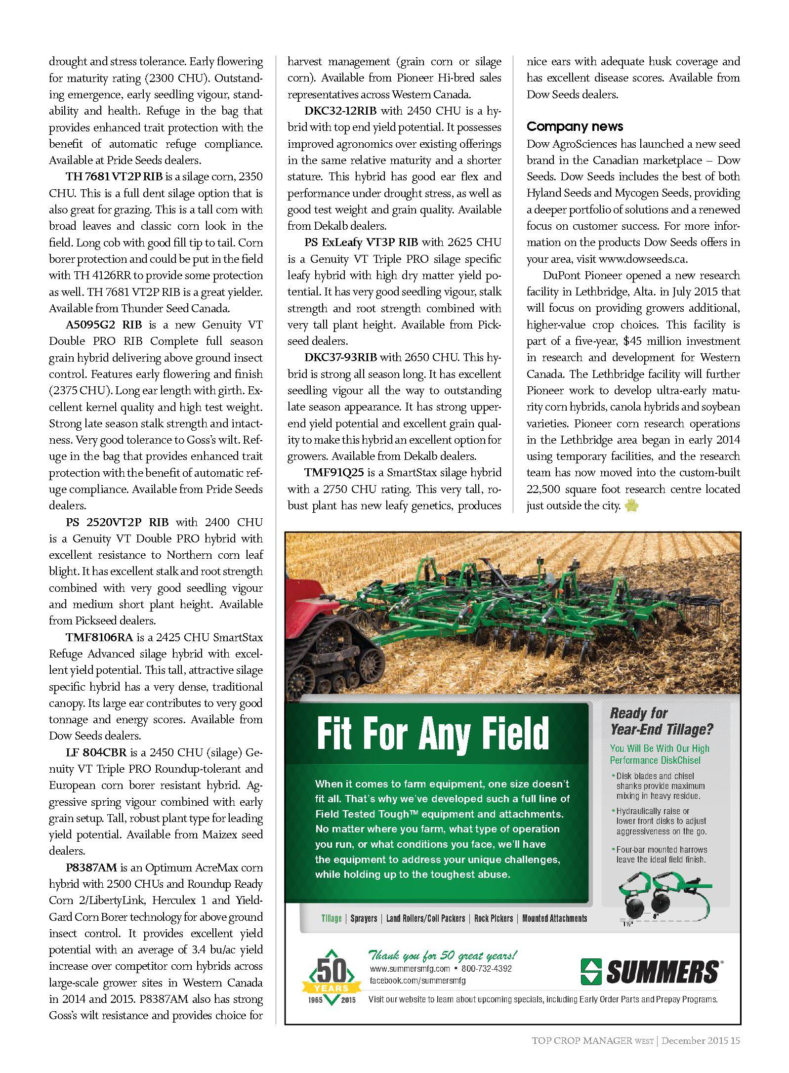 Corn breeders continue to focus on early maturing corn hybrids, bringing myriad stacked traits to western Canadian corn growers. Seed companies have supplied information on the new corn hybrids for 2016, and growers are advised to check local performance trials to help in variety selection. Listing is by CHU.