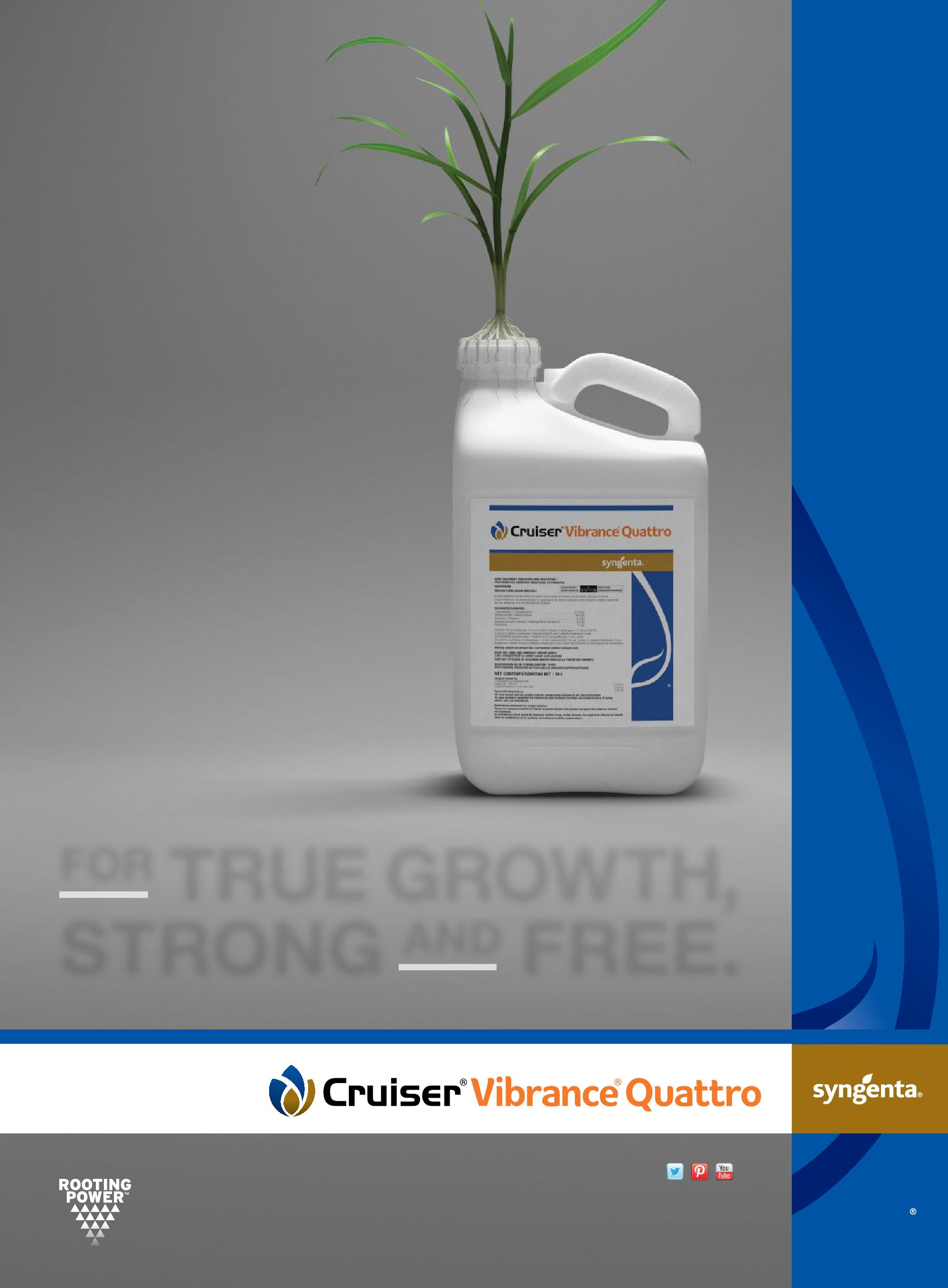 The built-for-Canada-all-in-oneso-your-cereals-can-thrive treatment. We know you love to see your cereal crops grow to their fullest potential. And in true Canadian fashion, we’d like to give you a hand with that. Meet our new Cruiser ® Vibrance® Quattro seed treatment. With four fungicides, an insecticide and the added benefits of Vigor Trigger ® and Rooting Power™, this all-in-one liquid formulation offers superior protection plus enhanced crop establishment for early-season growth. Just the helping hand you can use, eh?
