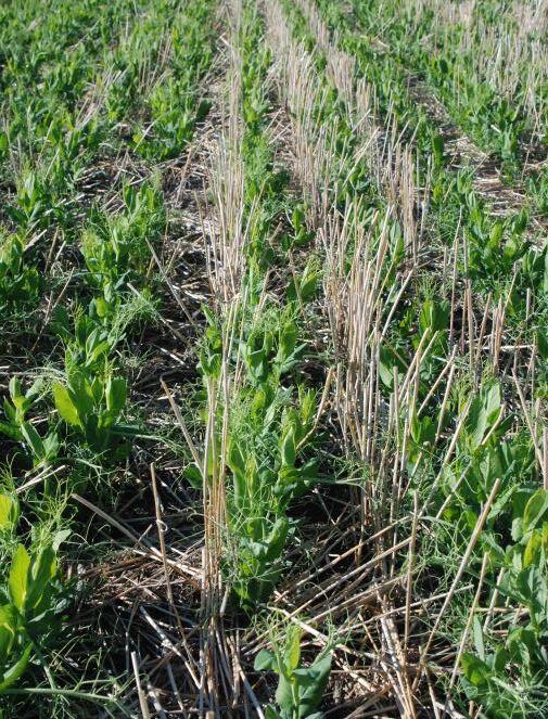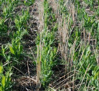 In the first year, spring wheat was grown under no-till management. At harvest, wheat stubble was cut to 15 centimetres and left standing in the field. In the second year, 10 types of pulse crops were grown between the rows of standing wheat stubble. The pulses, along with barley and the chemfallow check, were arranged in a randomized, complete block with four replicates. In the third year, durum wheat was uniformly grown on the different residue types.
