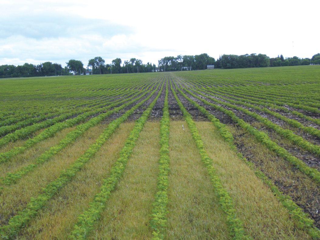 TOP: The yellow foxtail is the Valtera check in the front; the back is the Valtera treatment at 40 ac/jug, applied three days after the Roundup Ready soybeans have been seeded. The entire field had been sprayed with a half-litre of glyphosate, three to four days before the picture was taken.