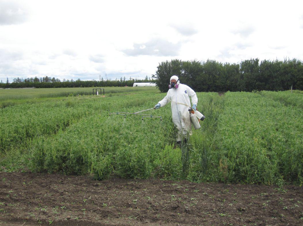 ABOVE: Applying a fungicide to small-plot research on ascochyta in field pea.