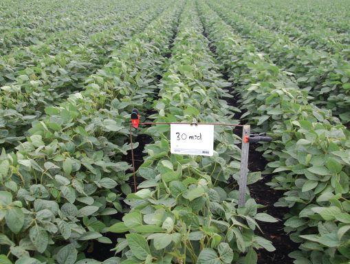 INSET: A field of soybeans that had tribenuron burnoff sprayed to take out volunteer canola, then beans seeded. Within three days of seeding, Valtera sprayed at the 40 ac/jug rate. Glyphosate was applied in crop, in one pass.