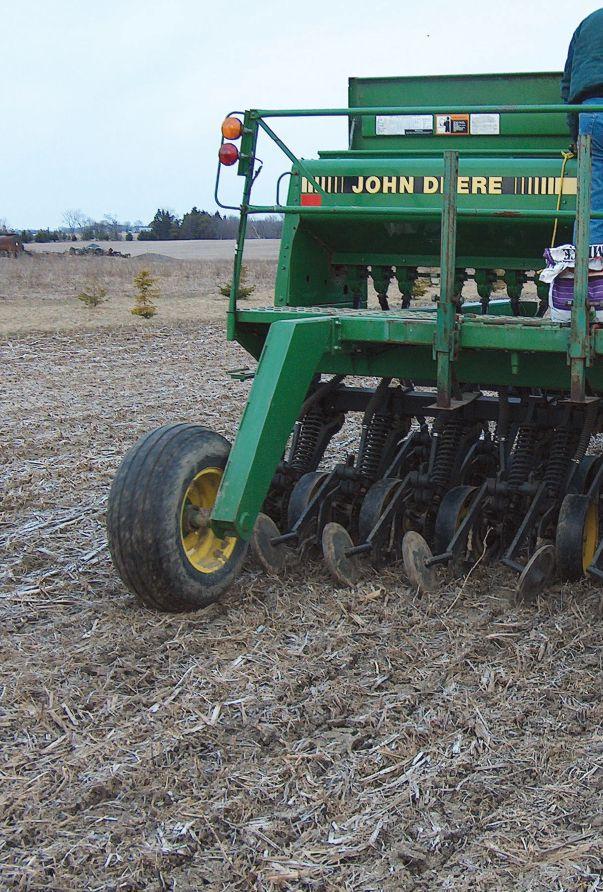 Beck has tried dormant seeding of the other cool-season crops grown at the farm, with quite a bit less success than with spring wheat. one reason spring wheat does well is that its growing point stays belowground until the plant has four leaves and has tillered. So its growing point is still protected even if the crop starts to grow during a warm spell in the winter and then a frost hits.