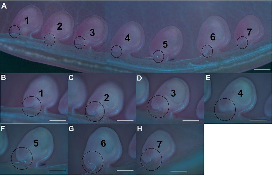 Ovules 2, 3, 6 and 7 received pollen tubes, but ovules 1, 4 and 5 did not receive a pollen tube after seven days of heat. Scale bars = 200 µm.
