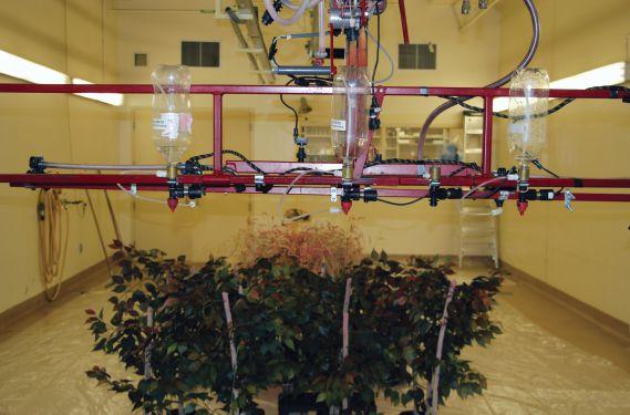 <LEFT: Spraying fungicides using a track sprayer in the lab and tracing them through a crop canopy.