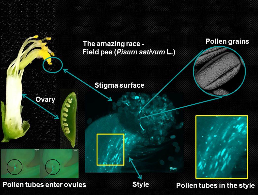 where the pollen grains germinate and grow pollen tubes through the style to the ovary below. The fertilized ovules become seeds in the pea pod. Field pea is primarily self-pollinating. Pollination mostly occurs just before the flower opening.