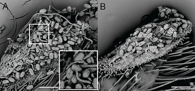 Pollen interaction with the pistil’s stigma region. High temperature resulted in fewer pollen grains on the stigma. Left: CDC Sage, 24/18 C day/night temperature. Right: CDC Sage, 35/18 C day/night temperature for five days. Scale bar = 100 µm.