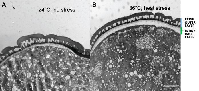 Jiang examined the structure of the pollen wall using a transmission electron microscope and found that heat stress caused the inner wall layer (intine) to almost double in thickness. She explains that the increased wall thickness might be a protective mechanism;