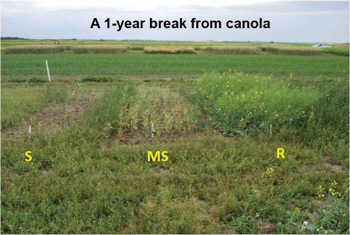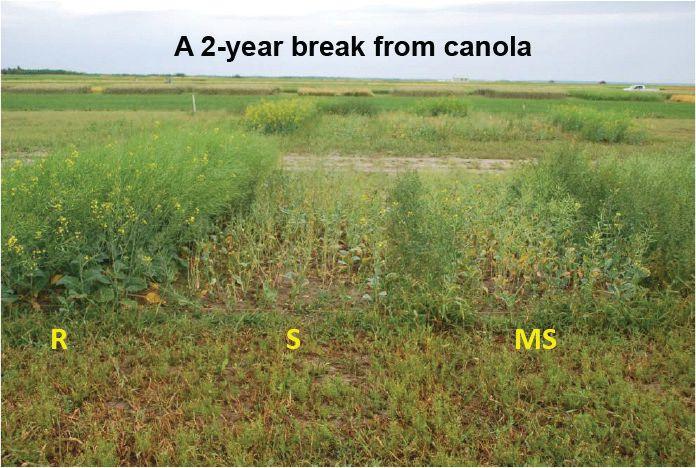 After a two-year break from canola, the R yields were improved by 25 per cent in this trial, compared to back-toback canola. The S and MS yields were slightly improved, but still very poor.