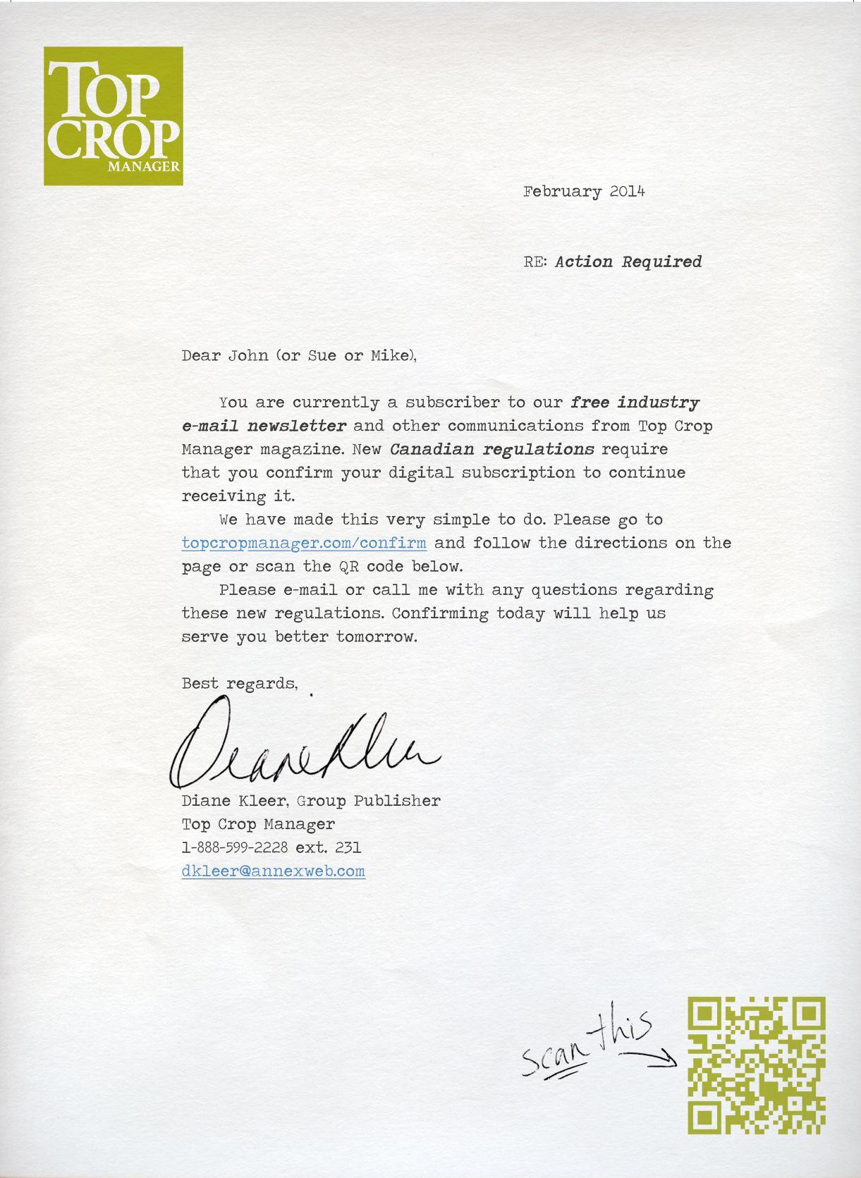 Occasionally, Top Crop Manager will mail information on behalf of industry-