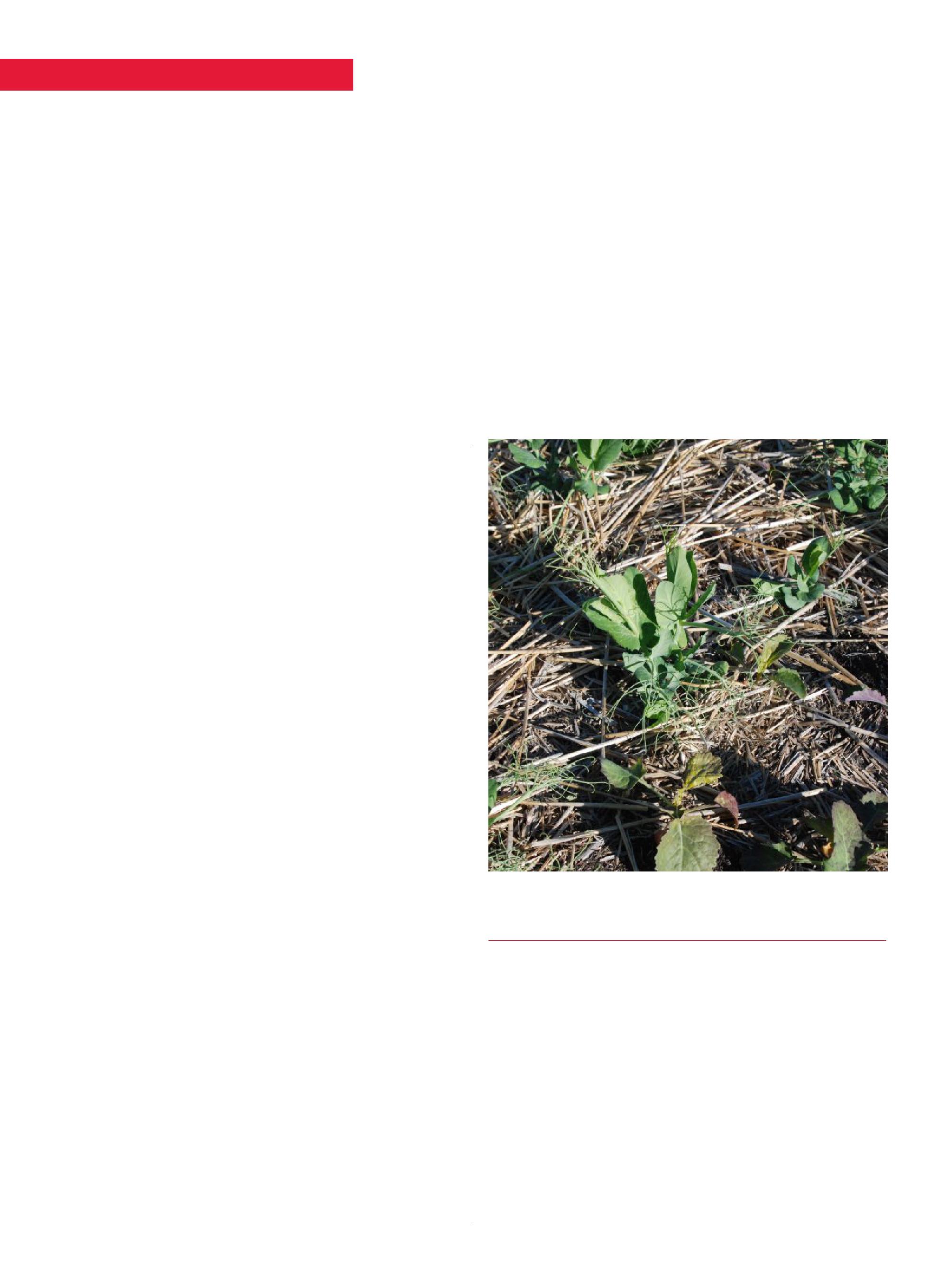 New herbicide options continue to expand weed control choices. Shown here is Group 2 control on canola (right) in a pea crop.