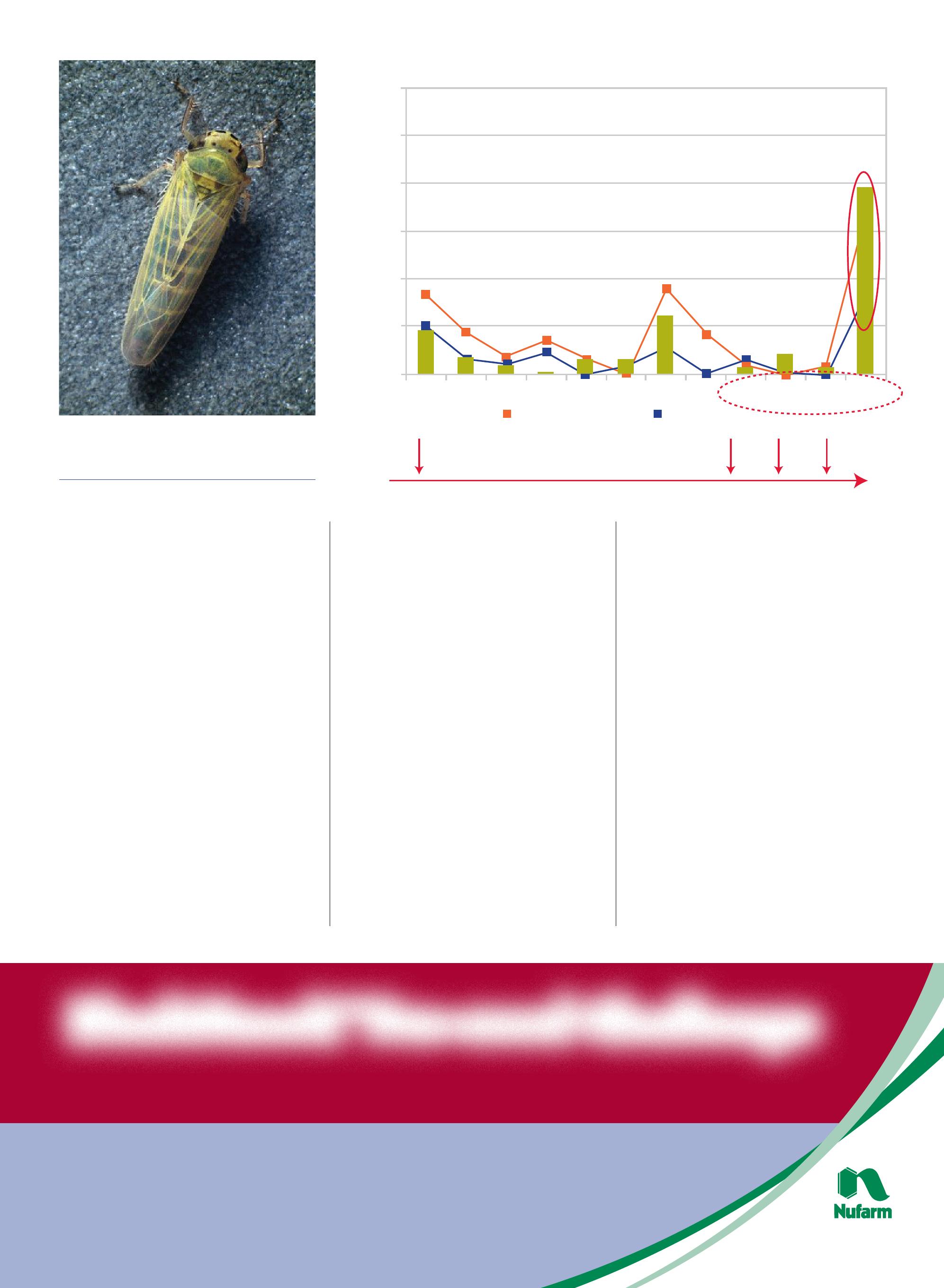 infections, 2012 followed a typical pattern. early winds brought the aster leafhopper to the prairies in early spring. The presence of the aster leafhopper was directly correlated to the outbreaks in 1957, 2001, 2007 and 2012. However, the number of aster leafhoppers infected by the mycoplasma was much higher in 2012 than in previous outbreaks.