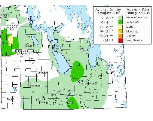 the August survey, indicating a reduced risk overall of economical levels of grasshoppers. Highest average counts were in northwest Manitoba, but even these were in the light risk range. However, farmers and agronomists are still encouraged to monitor field edges and areas where grasshopper emergence is known to be highest in June to gauge what levels are like in preferred egg laying sites.
