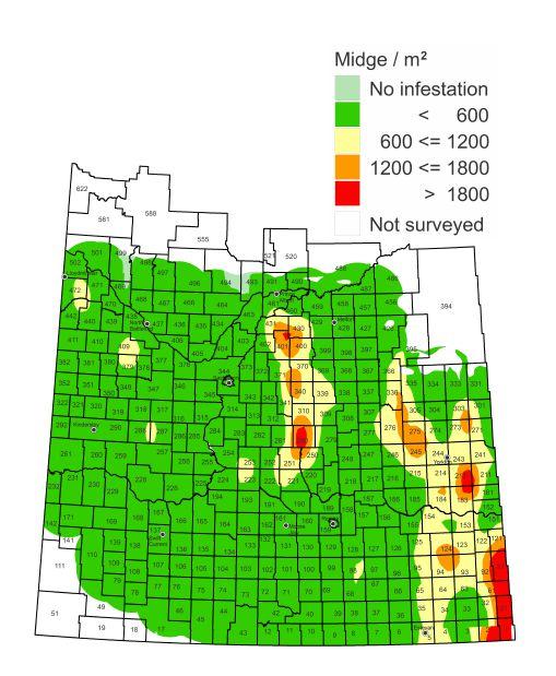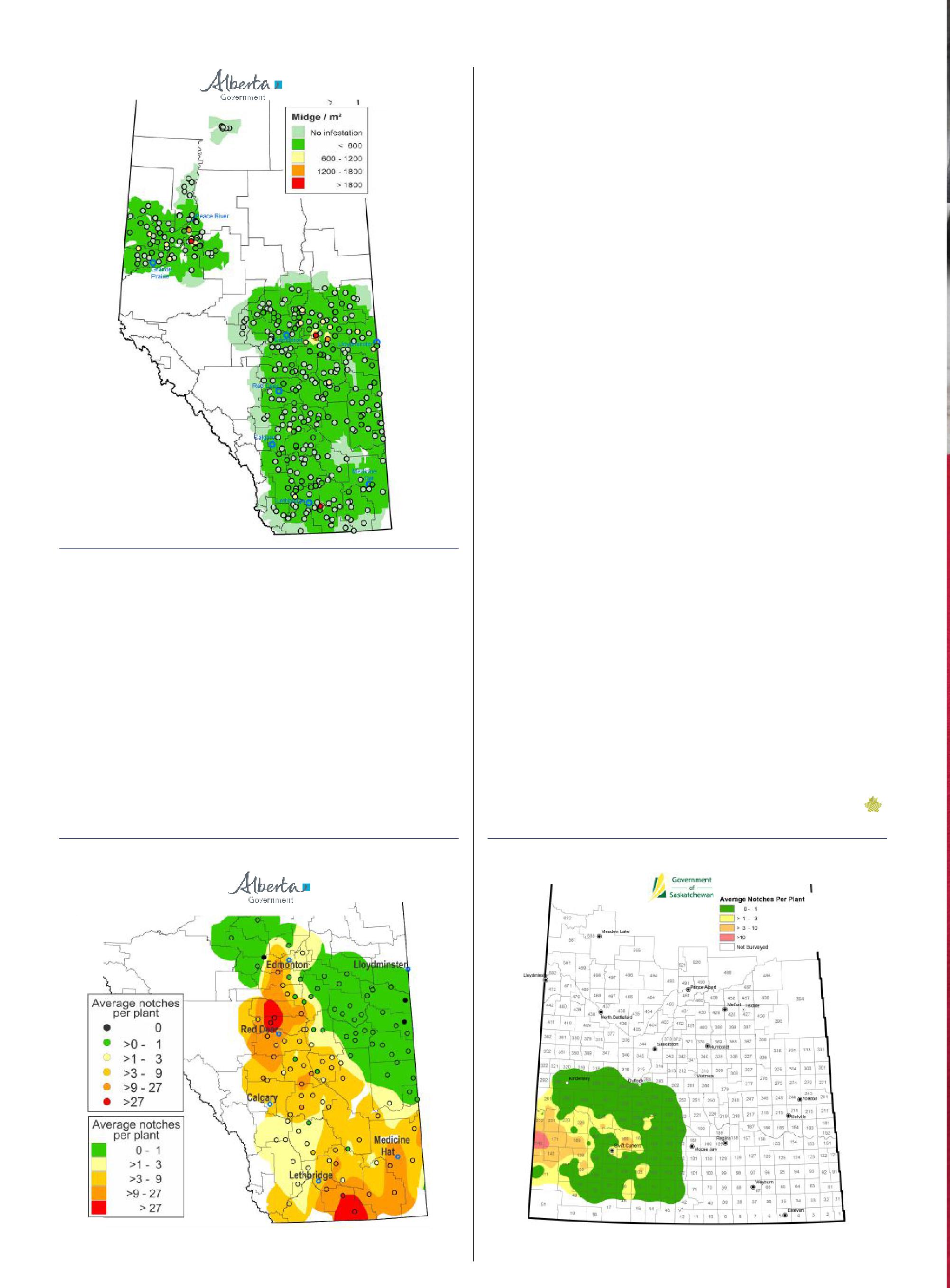 the east to areas around Lloydminster. The highest populations still appear to be in the northeast area of the province. Actual yield loss due to the swede midge in Saskatchewan has yet to be determined.