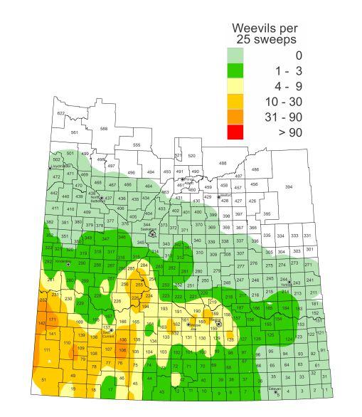 Meers says the cabbage seedpod weevil continues to expand its range. South of Highway No. 1 is the primary area, but it moved north of that in 2014 and was found in the Lacombe area in 2015, although not at threshold levels.