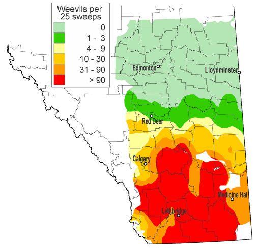 Overall, the level of pea leaf weevil feeding damage was lower in 2015 in Alberta. This is especially true in southern Alberta but experience has shown the level of pea leaf weevil activity observed is sufficient to cause significant damage if conditions are favourable in the spring of 2016. The most severe damage in 2015 was in areas southeast of Lethbridge and in central Alberta in Red Deer and Lacombe Counties. For any producers south of Highway 9 and along Highway 2 up to Leduc, there is risk of damaging levels of pea leaf weevil in 2016.