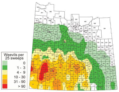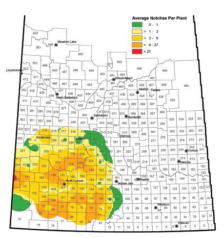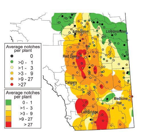 “While this is not a strict forecast, experience has shown us that activity levels greater than nine notches per plant is sufficient to cause significant damage if conditions are favourable in the spring of 2017. This covers a large area of southern and west-central Alberta,” he says.